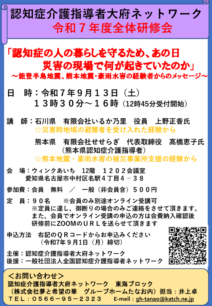 2025年8月6日 / 最終更新日時 : 2025年8月21日 zenkoku-DS 大府ネットワーク 【大府ネット】令和7年度 全体研修 ※ 上記チラシをクリック又はタップいただくとPDFをダウンロード いただけます。 申込 QRコード ※ 申込QRコードをクリックして申込 いただけます。 外部(Googleフォーム)