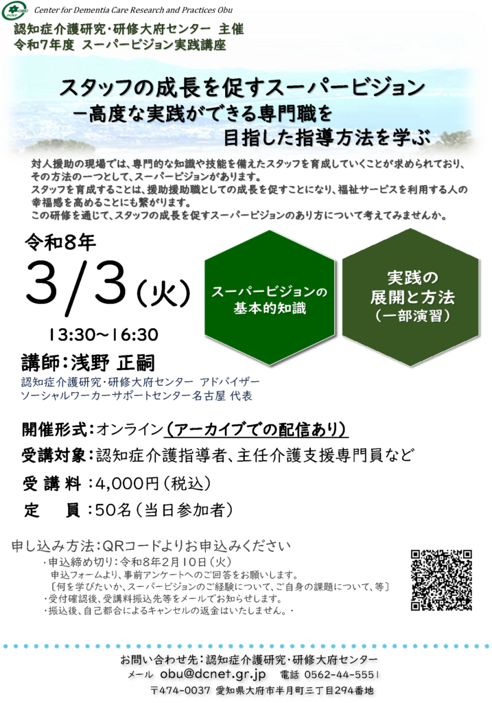 2026年1月16日 / 最終更新日時 : 2026年1月18日 zenkoku-DS 大府ネットワーク 【大府センタ―】令和7年度 スーパービジョン実践講座 ※ 上記チラシ画像をクリックでチラシのPDFをダウンロードいただけます。 申込QRコード ※ 上記QRコードをクリック いただくと、申込画面へ リンクします。 (googleフォーム使用)