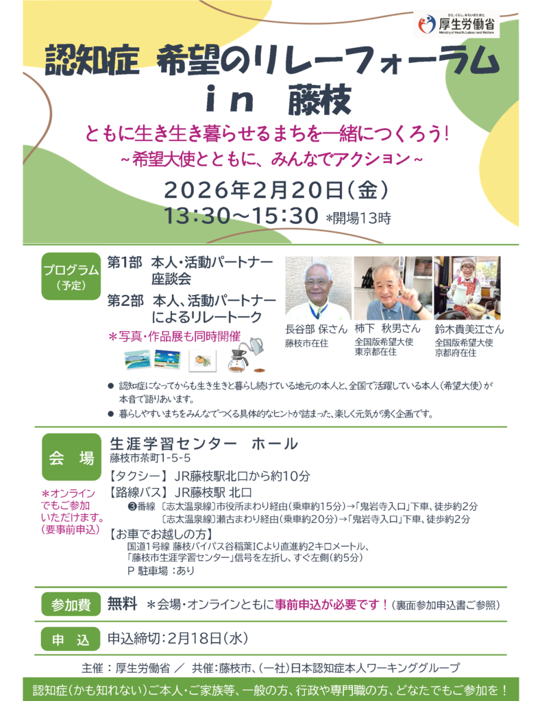 2026年1月18日 / 最終更新日時 : 2026年1月18日 zenkoku-DS 全国ネット 【厚労省】認知症 希望のリレーフォーラム in 藤枝 ※上記 チラシの画像をクリックしてチラシのPDFをダウンロードいただけます。 申込方法 ・QRコード(下に記載) ・電子メール又はFAX ※ 電子メール又はFAXをご希望の場合は、左記のチラシ画像からPDFデータをダウンロードして2ページ目の申込用紙をご利用願います。 QRコード ※ 上記QRコードをクリックして申込いただけます。